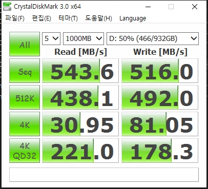 새것을 구입했다는... 성능 괜찮다는 소문(?) 때문에 그런진 몰라도 체감이 약간 느껴진다. 크마 3.0 기준으로도 시퀀셜이나 512K 쪽은 마이크론 1300 SSD 보다도 수치가 높은 편이기도 하다. 완전히 빈 공간인 1300 SSD와 반쯤 찬 S31을 벤치 한 것만으로도 용량이 크고 빈 공간이 많아서 조금씩 속도 차이가 나는 것이 아닐까.