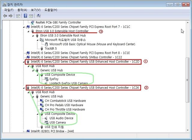 위 그림 상태를 기본으로 해서 마소 라이프캠 HD 3000이라는 웹캠을 ② USB 컨트롤러 장치에 연결되게 설정하였다.