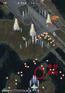 그리고 우측 2/3 지점에서 대기하면서 연신 샷만 쏩니다. 소형기가 역 v자형 짝수탄을 두번쏠겁니다. 화면 맨밑으로는 내려가지말고, 1~2 기체분정도 위에서 가만히 계십시오..물론 샷은 쏘시면서... 더이상 탄을 쏘지 않을때 완벽히 파괴하십시오