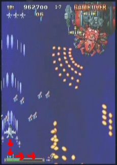 후자의 경우는 탄모양이 반대쪽으로 이동하기 쉽게 만들어지나 전자의 경우는 쉽지 않으므로 날개쪽엔 판정이 없다는 것을 이용해서 회피 해야 한다.