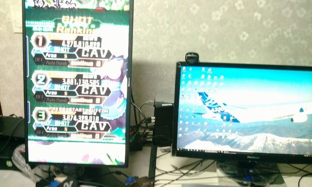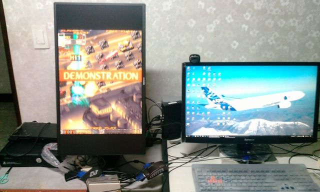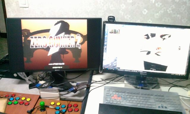 게임기쪽의 입력은 전부 D-Sub 를 이용해서 받았는데 이모니터를 선택한 이유중 하나가 고정종횡비를 지원한다는 점이 선택이유중 하나이다. 640 해상도도 제대로 입력받아서 출력이 된다. 세가 NAOMI 제로거너2 화면을 출력한것.