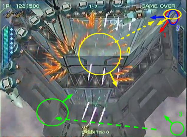 그림에서 원은 기체위치(대략적인) 이며 화살표는 샷방향의 대략적인 방향이다. 점선은 공격하면서 이동하는장소가 된다.