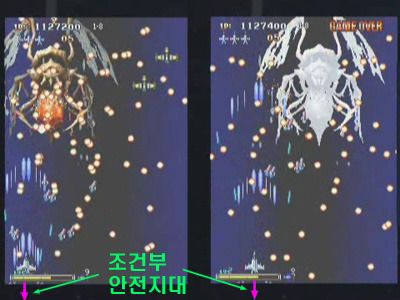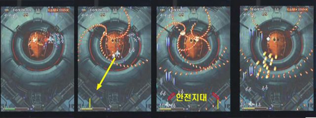 후자(상단이동)를 주로 이용하는데 옵션 소적탄 다발공격을 시작하면 재빨리 좌측구석에 붙어서 올라간후에 탄이 지나가면 내려와서 백탄을 다시 피해주는 방식으로 공략한다.