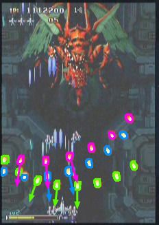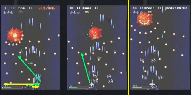 (백에 하나 잔챙이 소적탄이 가끔날라올 때가 있으므로 잔챙이가 나올때 쯤에는 기체를 위쪽으로 한두기체정도 위로 올리고 있다가 잔챙이 소적탄을 유도해준다. 침탄이 날아오면 다시 내려주기만하면 아무문제없다.