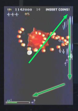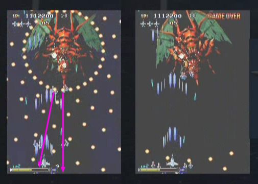 조준대모적탄을 발사하면 그림과 같은 화살표 형태로 피한다.핵의 간격을 일정하게 유지하는 형태로 이동하는 것이 포인트다.