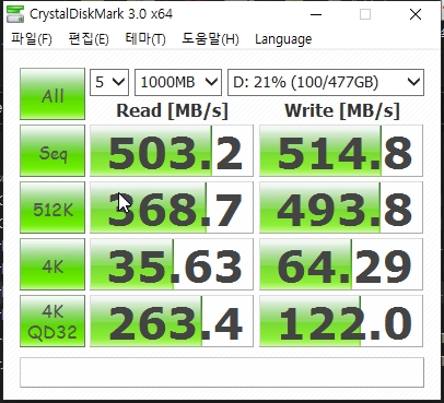 새것을 구입했다는... 성능 괜찮다는 소문(?) 때문에 그런진 몰라도 체감이 약간 느껴진다. 크마 3.0 기준으로도 시퀀셜이나 512K 쪽은 마이크론 1300 SSD 보다도 수치가 높은 편이기도 하다. 완전히 빈 공간인 1300 SSD와 반쯤 찬 S31을 벤치 한 것만으로도 용량이 크고 빈 공간이 많아서 조금씩 속도 차이가 나는 것이 아닐까.