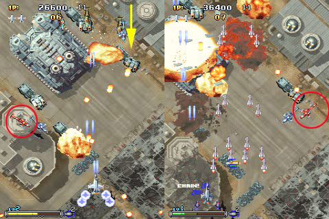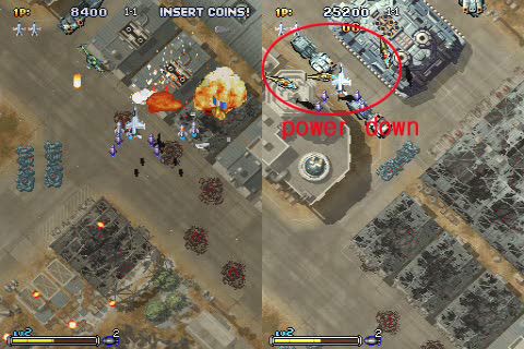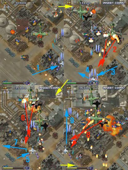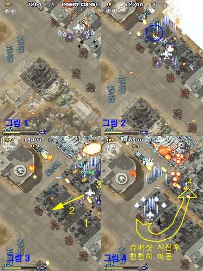 먼저 파워업 아이템 송사리기체(이후 파워캐리 헬기) 처리와 아이템 습득후 2단계 까지한후에 우측 건물을 수퍼샷을 사용하든 메인샷으로만 파괴하든 하고서 최대한 체인을 합니다. 중형탱크가 나올때쯤에 백탄 송사리기체헬기가 우측에서 2대 중간이나 좌측에서 두대 나오는데 이때 부딪혀서 파워 다운 시도, 너무 늦으면 파워캐리 헬기들이 않나오거나 한부대만 나오므로 나오자 마자 시도...그후에 좌측에 파워캐리 헬기들이 나옵니다.
