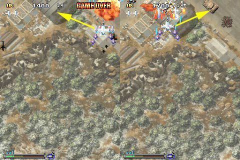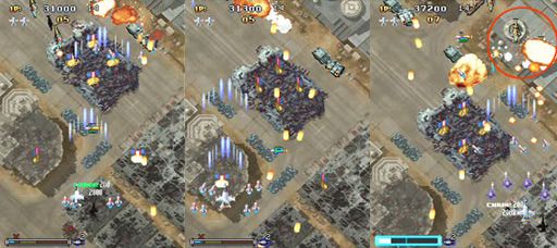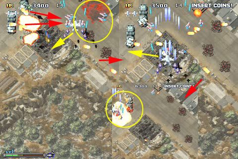 우측에 파워캐리 헬기가 등장할때까지(혹은 등장할 타이밍에) 적색 파워캐리기체는 놔둬야 합니다. 우측에 나올타이밍에 중형탱크와 파워캐리 기체들을 모두 격파하면 보통때보다 파워아이템이 하나 더나오기 때문에 파워아이템점수를(4000점) 더 벌수 있습니다. 그후에 패턴대로 공격후 메달을 체인하면 됩니다. 여기까지 파워아이템을 이용한 점수불리기 입니다.