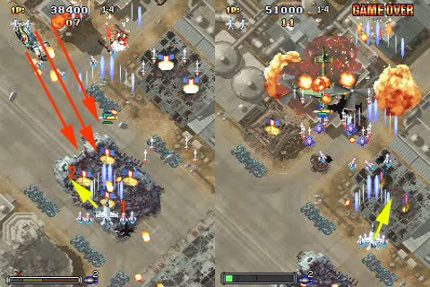 1. 첫중형헬기를 위의 그림에서처럼 집중적으로 수퍼샷을 맞춰서 빨리파괴 - 이경우 2번째나오는 좌측 중형헬기만 처리하면 되지만 이렇게 되면 백탄헬기가 등장해 가세하기때문에 백탄잔챙이헬기가 위협적이거나 중형헬기의 탄이 조금 위협적으로 될수가 있다.