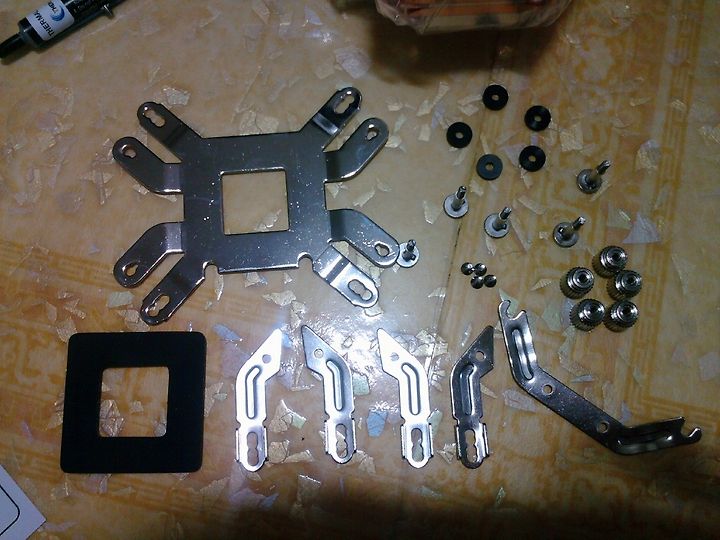 각 나사와 핀들은 한개씩 여유분이 들어있다. 정사각형 모서리쪽에 달린것은 인텔 시피유용 양쪽옆에 달린것은 AMD용