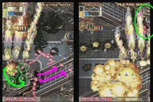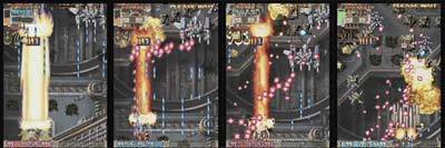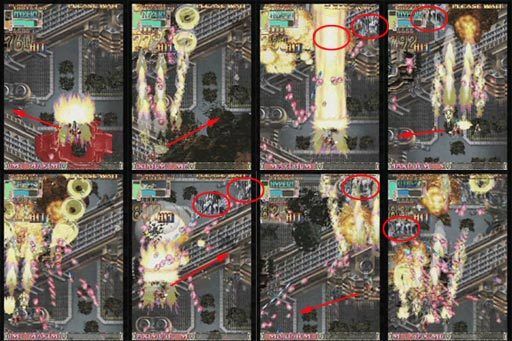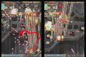 이때 다른 레이져 강화기체는 올라가서 조사하다 옆으로 빠지면서 콤보를 유지하지만 쇼티아는 느려서 그게 않됩니다. 가능이야 하지만 내려오기전에 탄에 갇혀 버리기 때문 입니다. 아래 탱크들을 바로 파괴할 정도로 근접하게 있다가 1UP 포대의 포신이 나오면 아래 전차 한대는 레이져 오라로 파괴하고 (포신에서 탄이 나올 타이밍 쯤에) 나머지는 샷으로 바꿔서 두대정도 파괴한후에 재빨리 레이져로 바꾸면서 포대 좌측에 레이져로 조사하면서 좌측으로 이동 합니다.