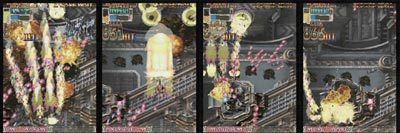 중형 전투기를 모두 파괴하고 나면 위쪽에 포대가 다수 등장 하는데, 일단 레이져를 조사해서 (샷도 가능하나 레이져가 좀더 안전(?)한편- 그림은 샷으로 처리하는 장면)GP 게이지를 유지 시키다가 왼쪽에 다시 충악이 나오면 샷을 이용해서 탱크들을 파괴후에 충악까지 속공 파괴 합니다.