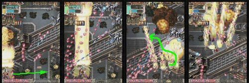 중형 전투기를 모두 파괴하면 조금 화면 구석위로 올라가서 포대와 탱크의 탄을 유도 하면서 오른쪽 중상단에 서 출현하는 소형전차로 콤보를 유지 하면서 탄 궤도가 빈곳으로 재빨리 연사 하면서 이동합니다.