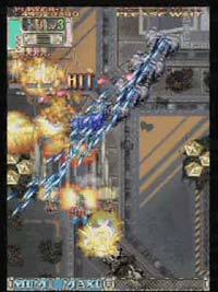 레이져로 연속으로 탱크까지 파괴한 후에 좌로 이동 합니다. 여기서 아조 중형 전투기가 다시 좌측에서 나오는데 3대가 엇갈려서 나옵니다. 2대까지는 샷으로 파괴하고 나머지 한대는 벌아이템 위치에서 내려오는데 레이져를 조사해서 파괴와 동시에 벌아이템도 동시에 불러냅니다. 도중 내려오는 하이퍼 아이템을 재빨리 습득 합니다. |